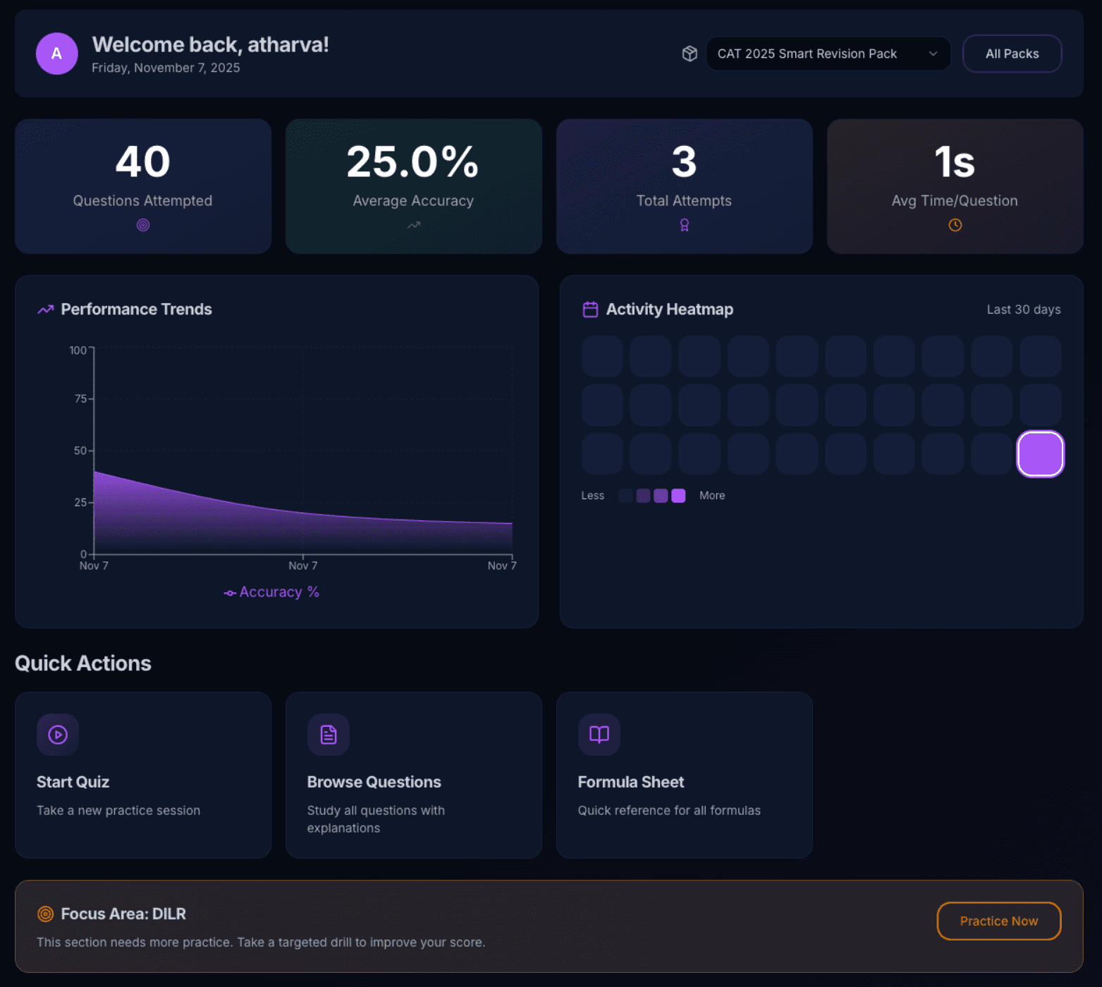 100 high-probability CAT questions, detailed explanations, and a complete Quant formula sheet — AI-curated from 10 years of CAT papers.